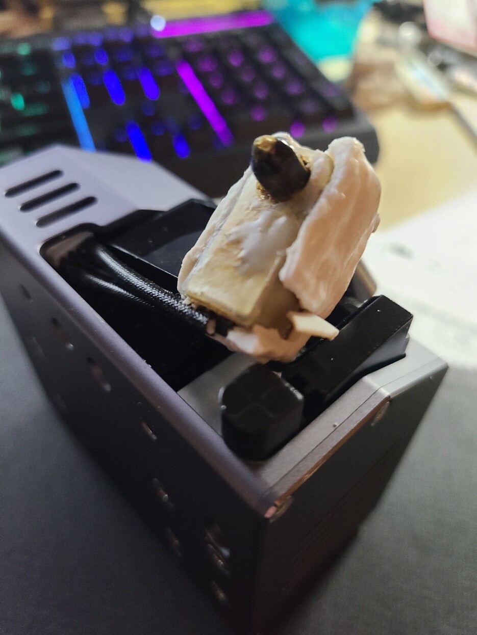 So I’ve been having some issues with printing these last few days, it doesn’t seem like the filament is flowing smoothly. So I take off the head and I’m loosing the hot end to clean the nozzle and surround area and I’m seeing all this white stuff around the hot end. I’m wondering is this supposed to be here because it’s providing some thermal insulation or is it likely just filament that’s gotten all melted up in there?