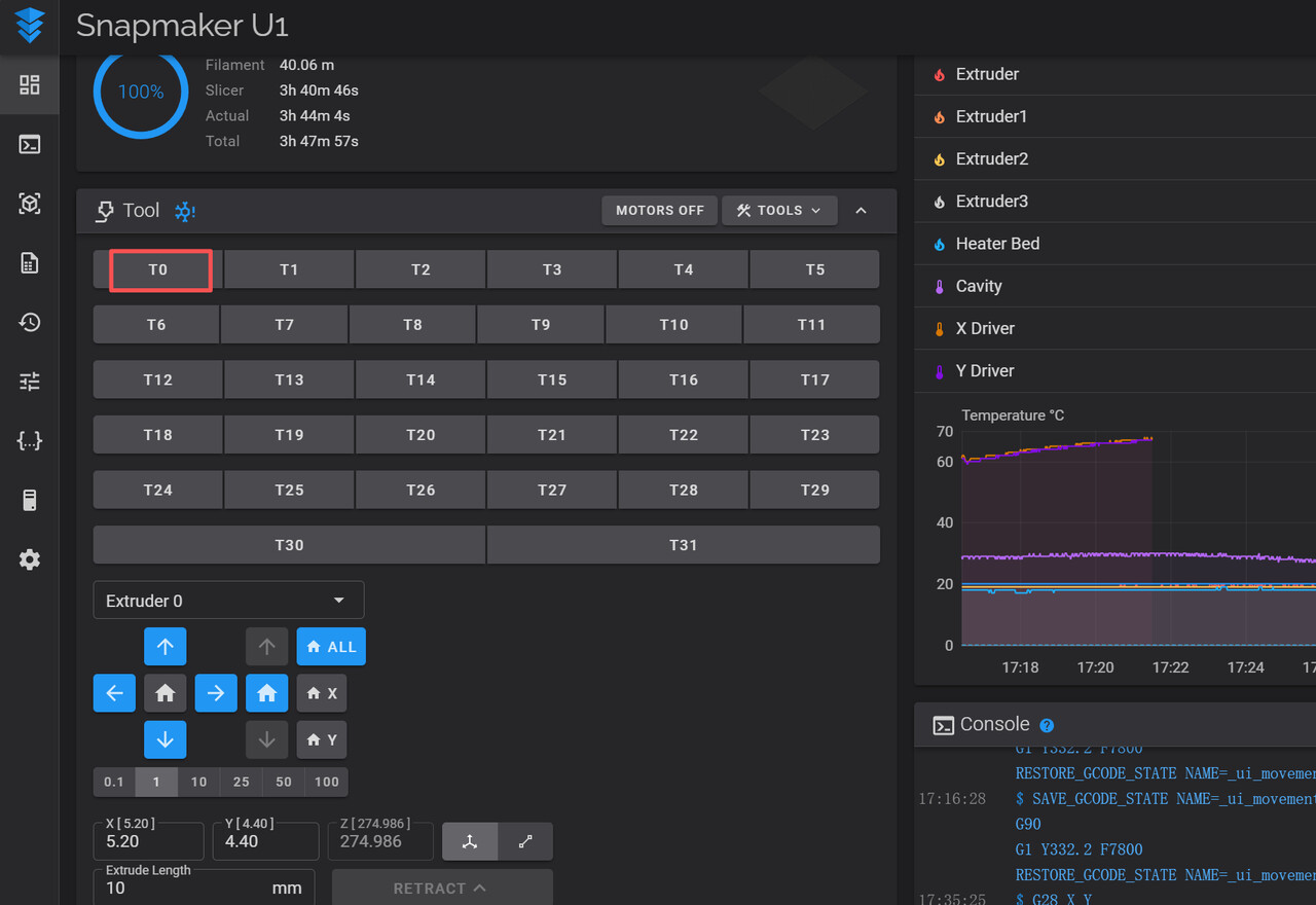 8. Verification: Return XY to zero in the browser, then cycle through T0–T3 and confirm the toolhead you just calibrated can pick and place normally.