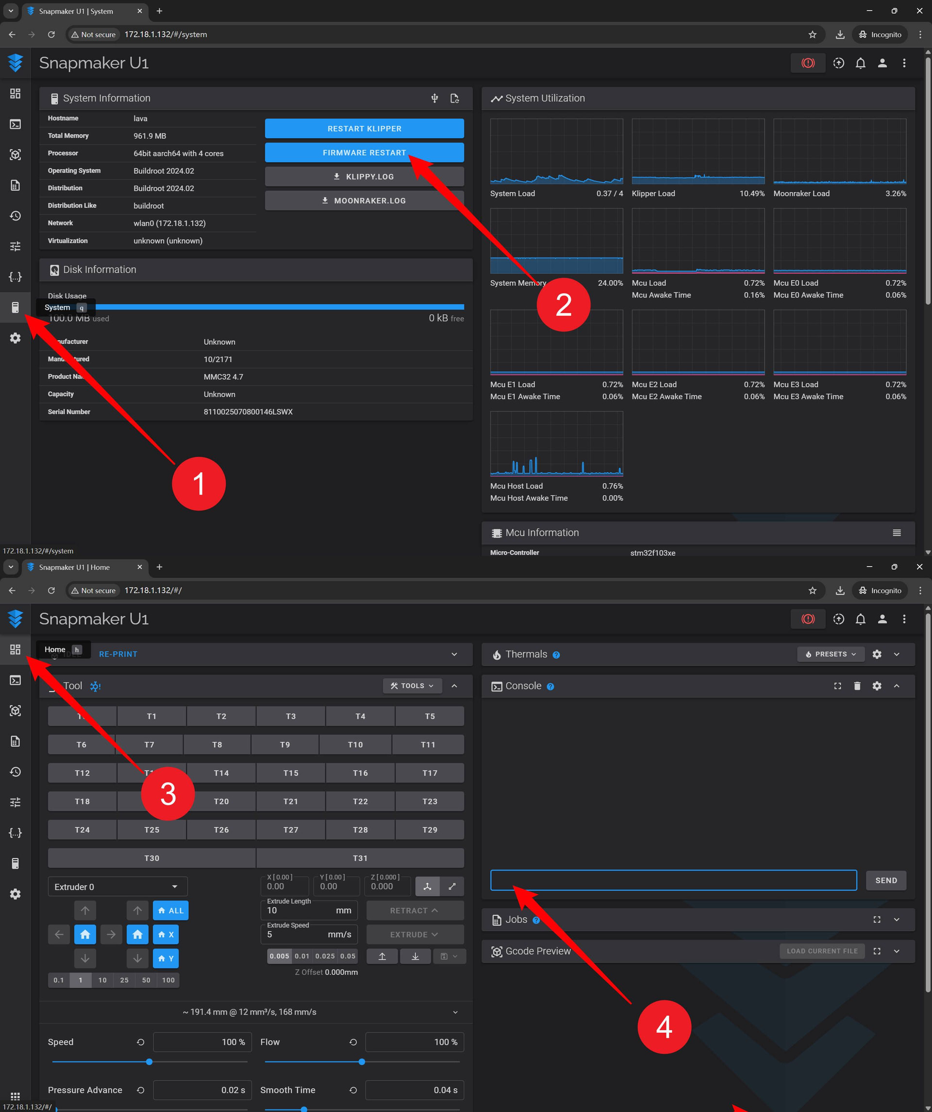 7.On the System page, click FIRMWARE RESTART. After the firmware restarts, go back to the Home page and send the pick/park command in the Console to verify if the updated coordinates work.
