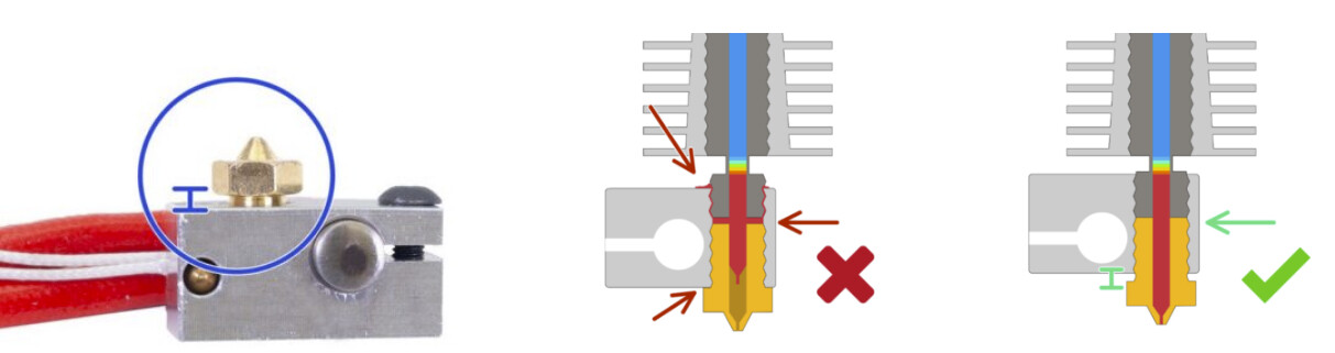 Inspect the mating surfaces of the nozzle and heat break. Make sure they are flat and without nicks and gouges.