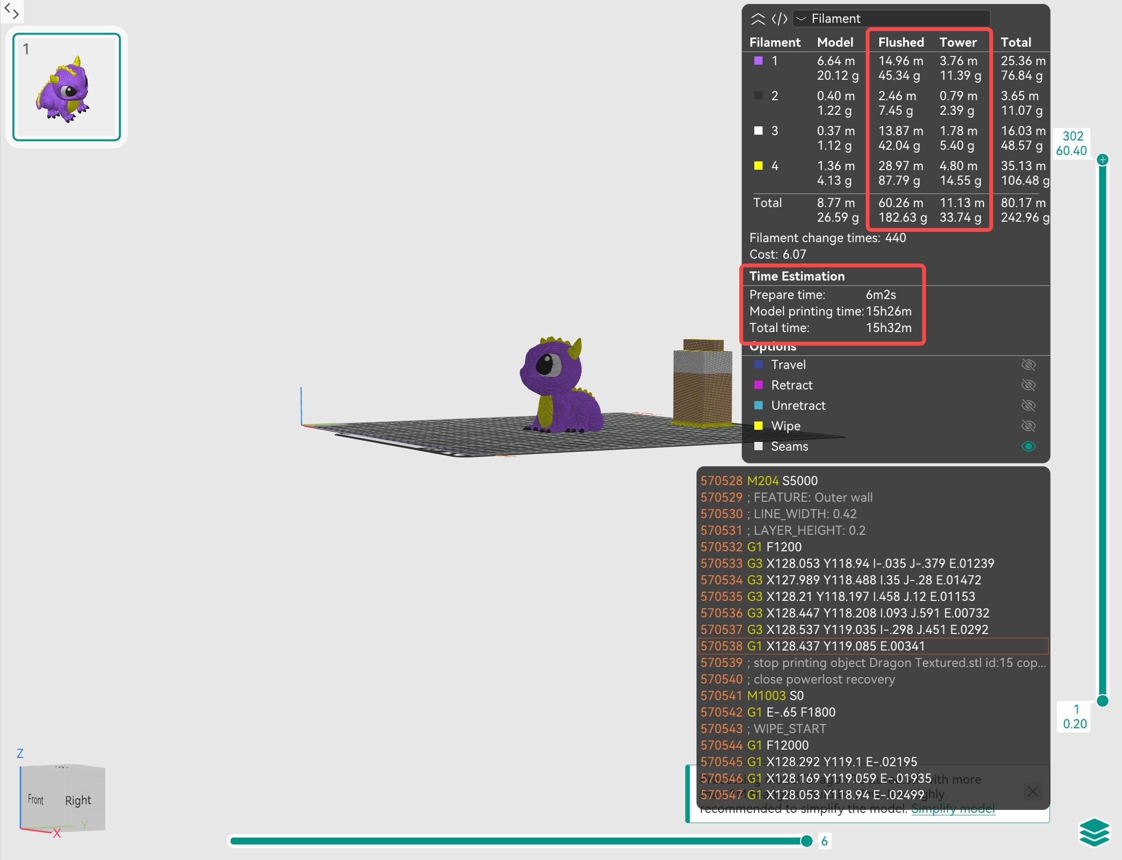 Estimated print time + filament waste (tower + purge/flushed material)