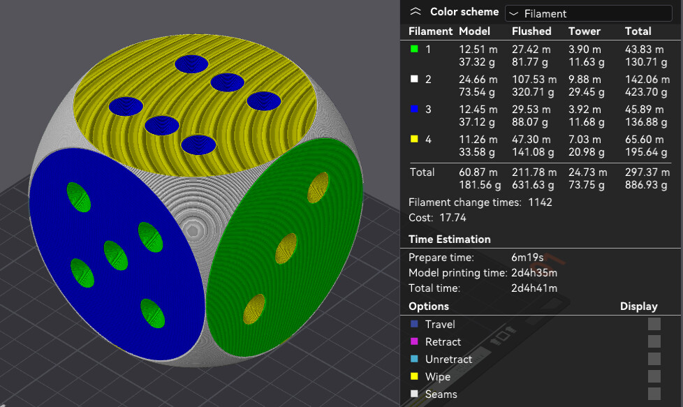 Here’s one! A very multi color, 6 sided die design I’d love to print oversized for my buddy’s kiddo. Slicing it here for an 80 mm cube with same speed/quality settings.