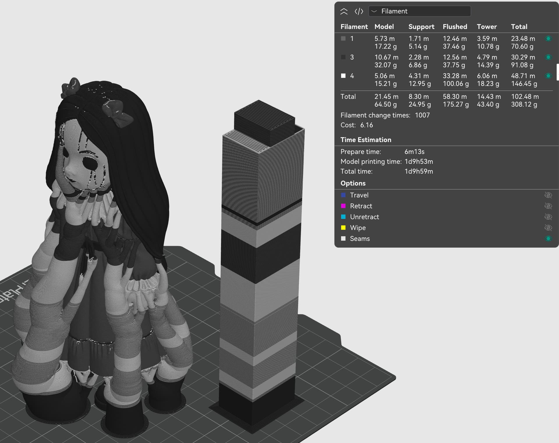 A1: Flushed 48.69 g Tower: 5.93 Model 15.70g and 4 hours 41 mins print time