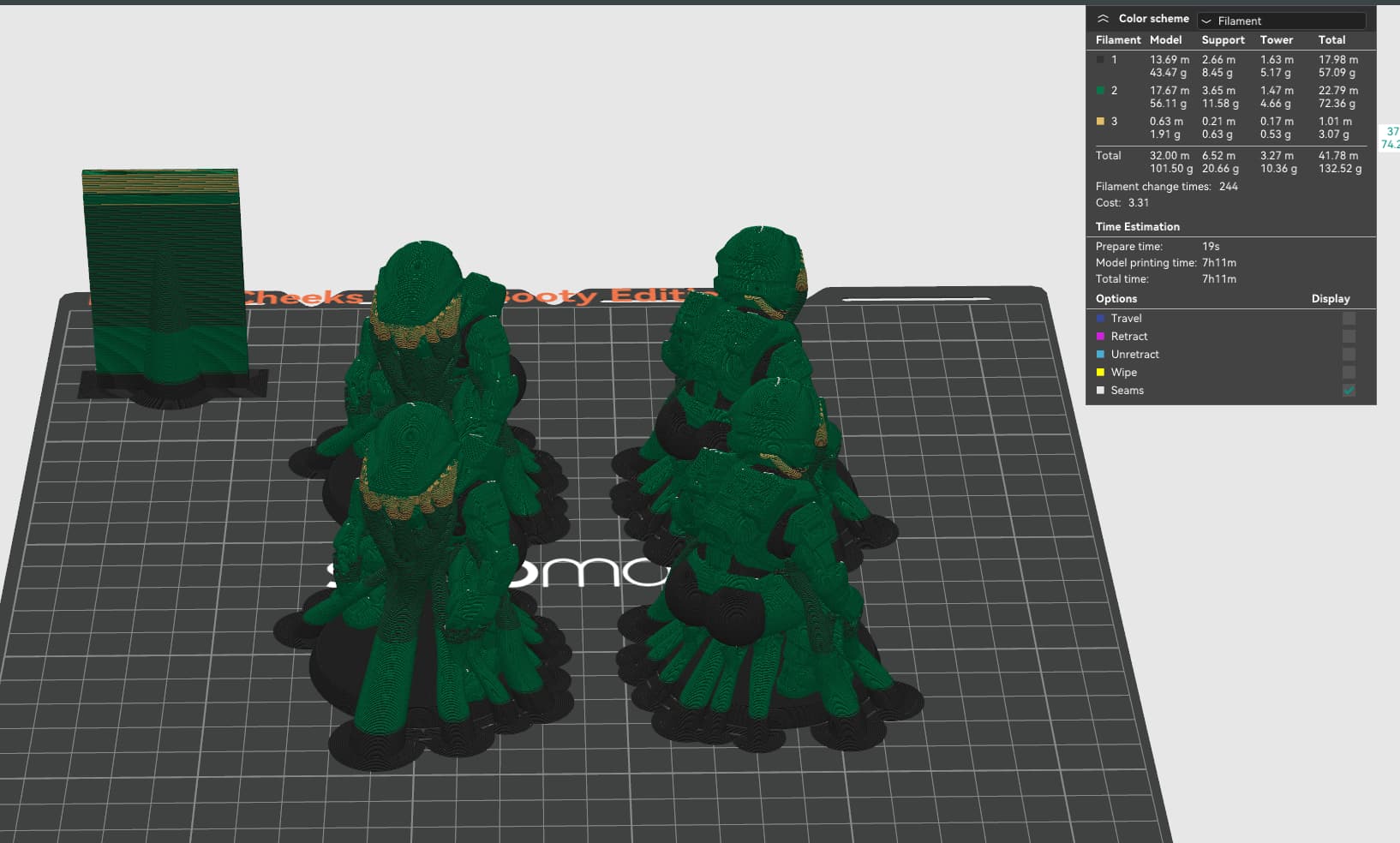 Process info: 0.16 mm, 15% adaptive cubic, 15mmX15mm prime tower (35x35 for the more conservative approach), tree supports