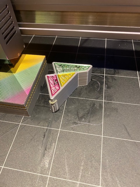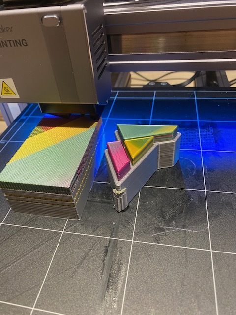 So it has taken me some time not only to get my “new space” set up but to get the Palette 2S set up and functional also. while not an easy task wasn’t the most difficult thing … the Raspberry Pi running Octoprint created some challenges as well! all new tech to me! still much to learn and much to tune in! while my first print, (albeit too large for a calibration print)was not a raving success, neither was it an epic fail. colour bleed along the way and at collar change intervals. I will use smaller prints in the future to calibrate the Palette. the purge block was nearly 3x the weight of the print but I think will make a nice collage once many are gathered! here are some pictures. if you have suggestions or need to gather my information (won’t take long ) leave a message here. here are some of my pictures. sorry don’t have octolapse set up yet. the print was for a guide for the Bowden tube from the Pallette.