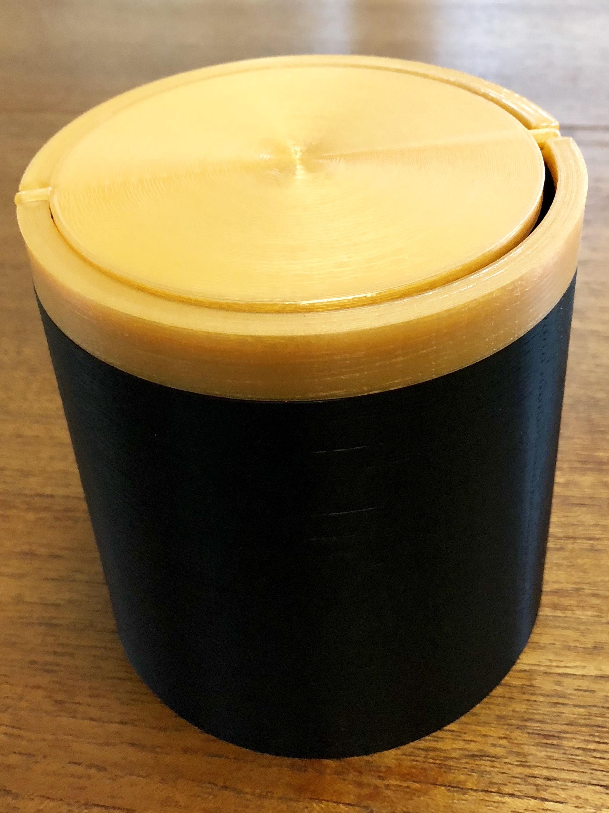 I’m very pleased with the result. I printed the main body at 0.3 mm and the lid and ring at 0.2 mm. Main body took 12 hours, the other bits about 2 hours and one hour respectively. Sliced with Simplify 3D. Materials are 3D Fillies PLA+ Black and translucent orange printed at 210 degrees and highest speed (for infills) at 100 mm/s.