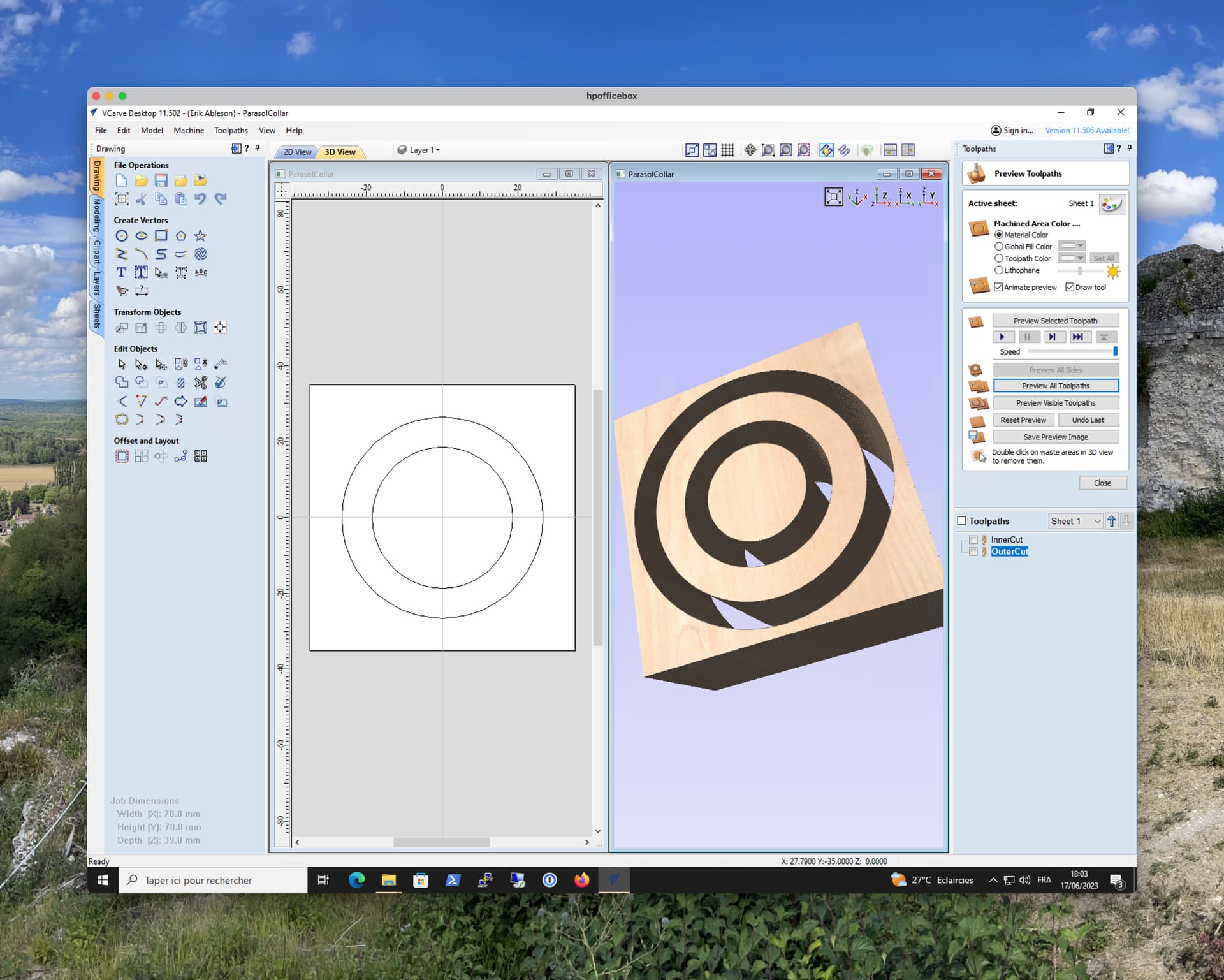 I’ve used the vCarve post-processor successfully in the past for both standard cuts as well as 3D stuff. But I haven’t use the CNC module in a while and I just created a very simple set of circular cuts in vCarve 11.5 to make a collar for a post and when I run this on the Snapmaker A350 it simply moves off-center and starts drilling down.